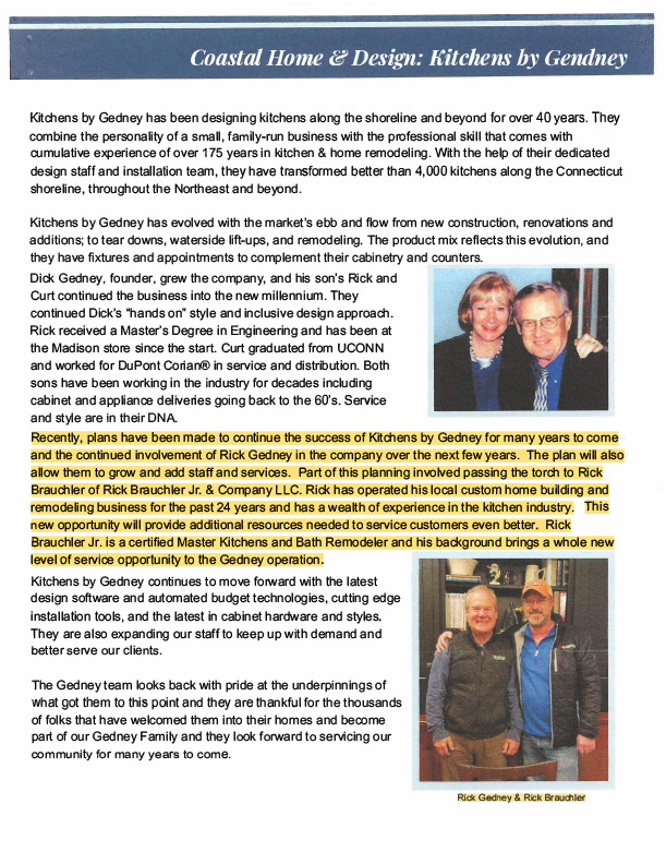 The Madison Chamber of Commerce announces the exciting news that we purchased Kitchens by Gedney!! The area’s premier kitchen design firm … our plan is to change nothing!! Well, maybe a little in the back of house but continuing the legacy Dick and Rick Gedney built is what matters most. This acquisition will allow us to keep more of a project in-house and under our management. However, we are always more than happy to work with whichever kitchen company you prefer.