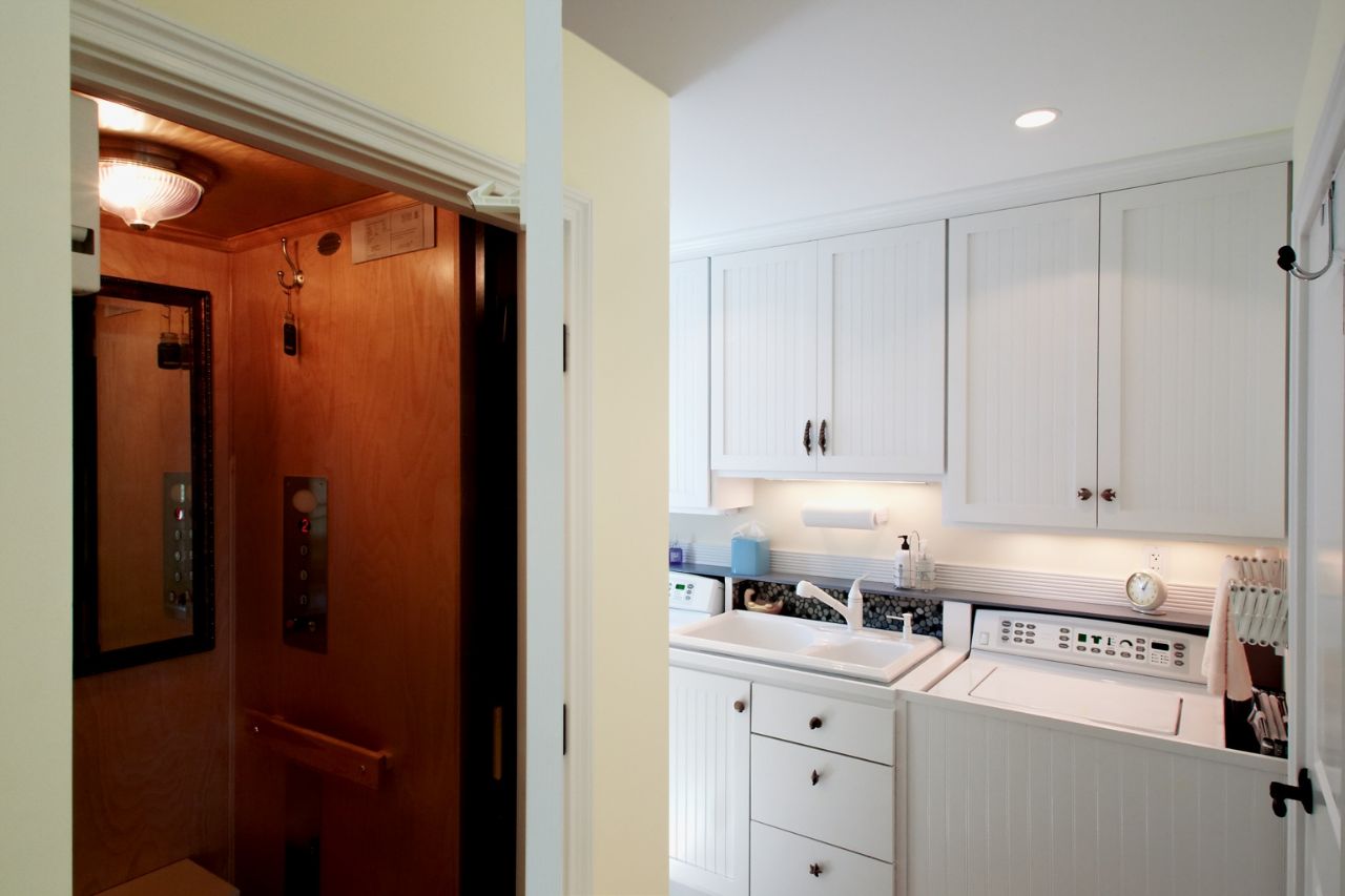 An elevator services all three floors which feature two bedrooms each with a private bath, a third floor full bath, 1st floor guest bath tucked under the stairs and custom site built cabinetry throughout.
